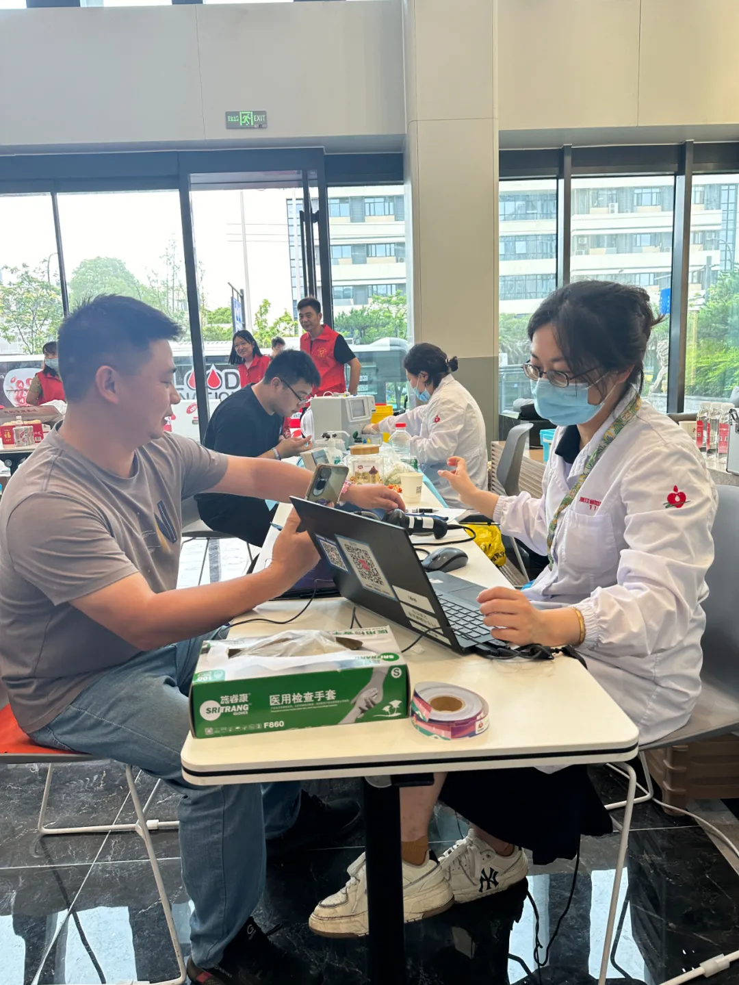 献血的同事们在党员志愿者的热心帮助下,有序进行体检、验血、抽血等流程,整个献血现场温馨且融洽。